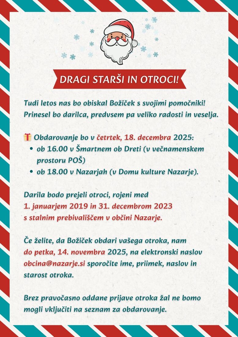 Če želite, da Božiček obdaruje tudi vašega otroka, nam do petka, 14. novembra 2025, na elektronski naslov obcina@nazarje.si sporočite ime, priimek, naslov in starost otroka.
