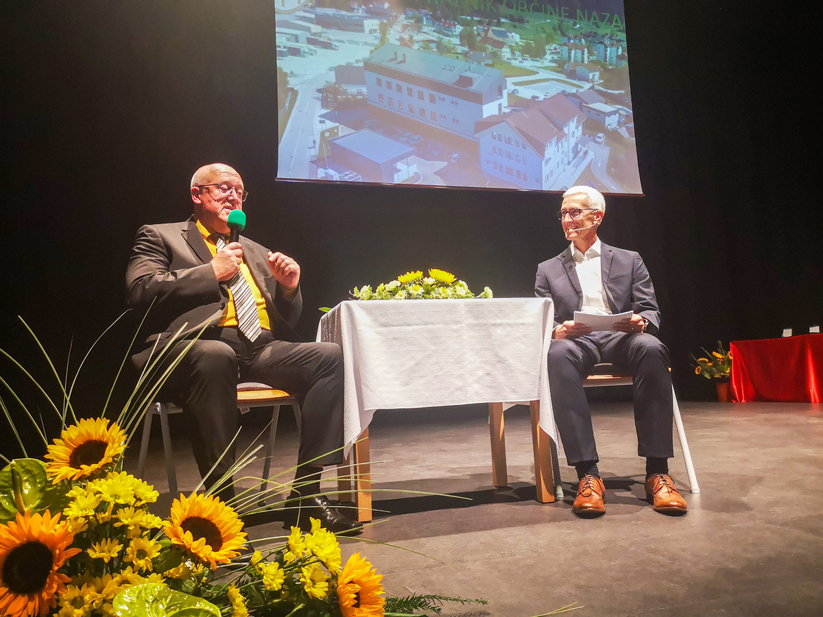 Slovesnost je povezoval moderator Franci Kotnik, ki je z županom Matejem Pečovnikom opravil zanimiv praznični intervju. Skozi sproščen pogovor sta osvetlila najbolj aktualne teme, pridobitve, projekte in načrte v občini. Ker letos mineva 30 let od ustanovitve Občine Nazarje, je sledil še zanimiv pregled minulih treh desetletij, ki ga je dopolnila projekcija časopisnih prispevkov iz tega obdobja.