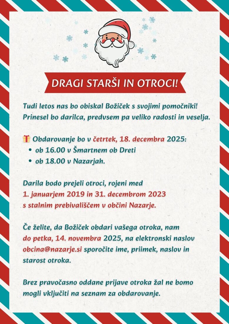 Če želite, da Božiček obdaruje tudi vašega otroka, nam do petka, 14. novembra 2025, na elektronski naslov obcina@nazarje.si sporočite ime, priimek, naslov in starost otroka.