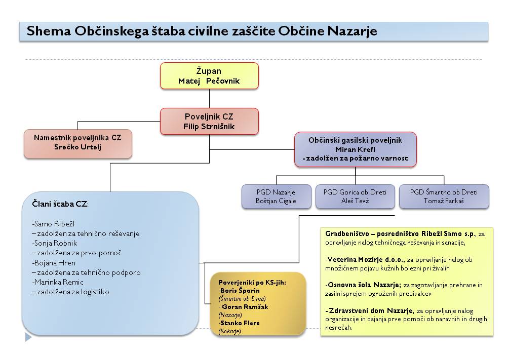 Na podlagi 2. in 4. točke 81. člena, 2. točke 87. člena ter 2. točke 98. člena Zakona o varstvu pred naravnimi in drugimi nesrečami ( Uradni lis RS, št. 51/06-ZVNDN UPB1 in 105/06) in 32. člena Statuta Občine Nazarje (Ur. gl. ZSO, št. 1/2011 in 2/2011) so bili sprejeti Sklep o imenovanju poveljnika in namestnika poveljnika ter članov Občinskega štaba civilne zaščite občine Nazarje ter Sklepi o imenovanju poverjenikov za civilno zaščito.